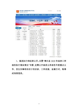 3、推进执行和结果公开。设置“博兴县 2020 年政府工作 报告执行落实情况”专题,定期公开政府工作报告年度重点工 作、民生实事项目的计划安排、工作进展、监督方式、取得 成效等信息。 9